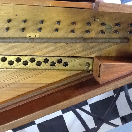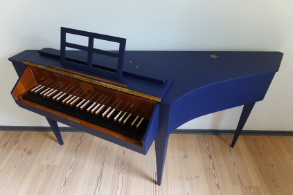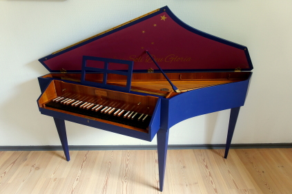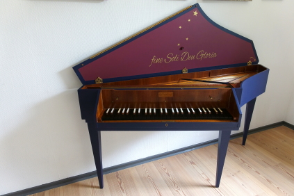 Spinettet med åbent låg. Nu er lyden betydeliget kraftigere, klar og destinkt. Meget velegnet til basso continuo spil. Spinettet er forsynet med to dæmpere, et til bassen og et til diskanten, som således kan dæmpes uafhængigt af hinanden.
